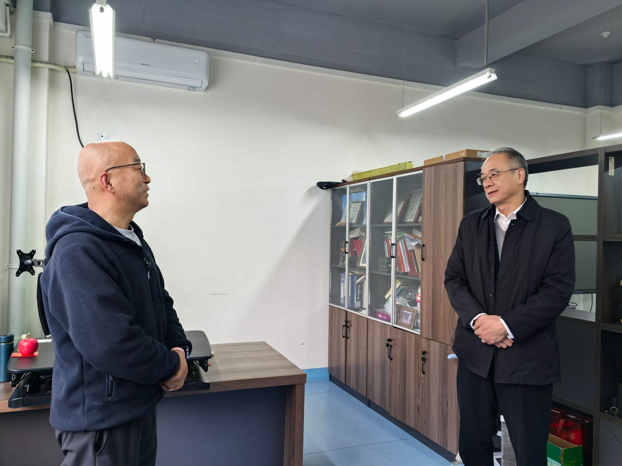 办公区域,与全职引进的国家级人才白晨曦教授亲切交流,关心询问其工作开展、国产成人