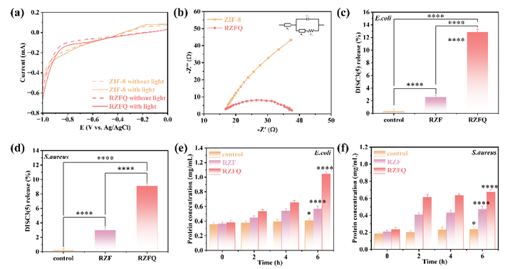 图3:(a)有光和无光的RZFQ和ZIF-8的LSV曲线。(b)RZFQ和ZIF-8的EIS曲线。(c)大肠杆菌和(d)金黄色葡萄球菌的DISC3(5)释放率。(e)大肠杆菌和(f)金黄色葡萄球菌的蛋白质泄漏。