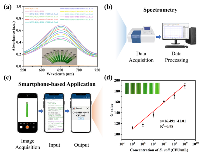 图4:大肠杆菌检测:(a)紫外-可见光谱、颜色响应数码照片(插图)。(b)光谱检测程序。(c)智能识别程序。(d)G值与大肠杆菌浓度之间的拟合曲线。