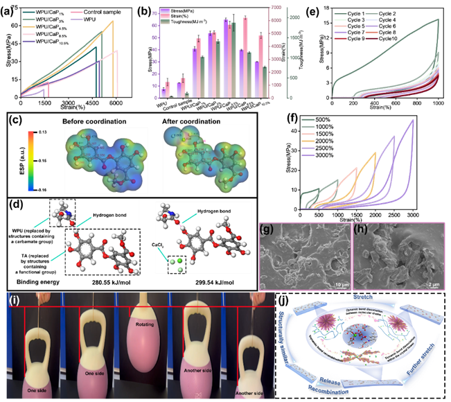 图5.(a)弹性体样品的应力-应变曲线;(b)对应的拉伸强度、拉伸应变及拉伸韧性;(c)单宁酸部分结构在配位作用前后的静电势分布;(d)单宁酸分子(部分结构)配位前后和WPU的氢键结合能变化;(e-f)WPU/CaP4.5%弹性体在不同条件下的循环加卸载拉伸曲线:(e)固定应变1000%条件下,(f)应变递增条件下;(g-h)WPU/CaP4.5%弹性体拉伸断裂截面的SEM图;(i)WPU/CaP4.5%样品举起自重约32000倍重物实物的照片;(j)拉伸过程中微观结构演化及增强增韧机制示意图。