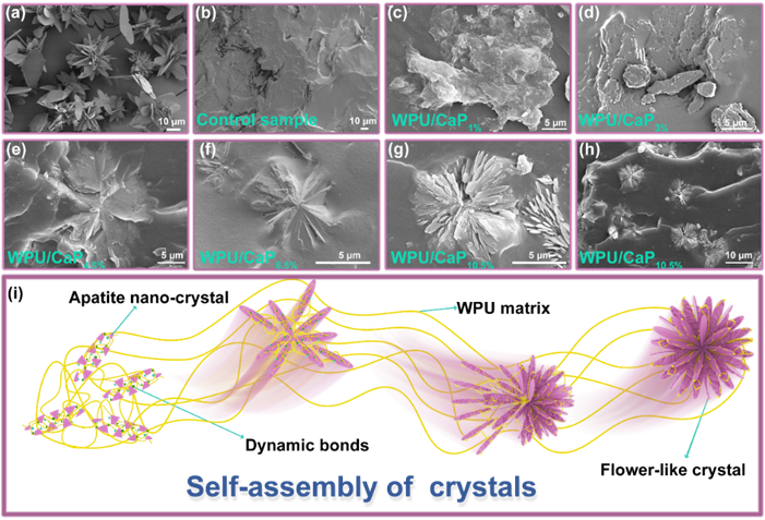 图3. 矿物与弹性体的SEM图:(a)Minerals4.5%的SEM图(该矿物样品是通过与WPU/CaP4.5%相同浓度的Ca²⁺、HPO₄²⁻和H₂PO₄⁻在水溶液中直接矿化获得);(b)直接将矿物Minerals4.5%掺入WPU/TA水溶液中制备的对照组样品的SEM图;(c-f)分别为WPU/CaP1%、WPU/CaP3%、WPU/CaP4.5%及WPU/CaP8.5%弹性体的SEM图;(g-h)不同放大倍数下WPU/CaP10.5%弹性体的SEM图;(i)WPU基体中磷灰石纳米晶体组装形成花状矿物的过程示意图。