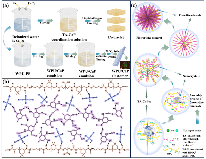 创新策略与核心机理:本研究最核心的创新在于设计了一种“冰控界面介质”反应体系。该策略巧妙地将预配位的TA-Ca²⁺冰晶块引入预交联的WPU的乳液中。随着冰块的融化,Ca²⁺被逐步释放,并在冰-水界面与预交联在WPU上的阴离子相遇,在静电引力下形成磷酸氢钙化合物。关键在于,整个矿化过程受到TA和WPU及其交联的精准调控:TA与Ca²⁺的强配位作用使其吸附在晶胞表面,而TA的酚羟基与WPU的羰基、氨基之间的强氢键作用则促使WPU大分子聚集在晶胞周围。这种有机分子的空间位阻效应有效限制了矿物晶片的过度生长,同时,TA与WPU之间的物理交联诱导了纳米晶体组装成片状结构,并最终随着冰的融化,以“自下而上”的模式组装成稳定的花状矿物形态。