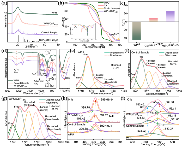 图2. 通过不同方法对纯WPU、对照样及代表性弹性体WPU/CaP4.5%进行对比表征:(a)XRD图谱;(b)TGA曲线;(c)通DMA测得的玻璃化转变温度;(d) FT-IR光谱;(e-g)分别为WPU、对照样和WPU/CaP4.5%弹性体在C=O伸缩振动区域的FT-IR光谱;(h,i)WPU/CaP4.5%弹性体的N 1s和O 1s高分辨率XPS谱图。