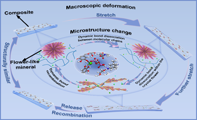 摘要:开发具备仿肌肉特性(如高韧性、强度、弹性及自愈合能力)的材料一直是材料科学领域的重大挑战。受生物矿化过程中大分子调控晶体组装机制的启发,本研究提出了一种利用冰控界面介质诱导矿物原位结晶与有序组装的仿生策略。基于该方法成功制备的水性聚氨酯(WPU)弹性体展现出卓越的综合性能:其韧性高达约1.9 GJ·m⁻³,断裂应力约65 MPa,断裂伸长率达6215%,并具备快速自愈合能力——仅需4分钟即可实现聚合物基体自愈合与矿物结构重构。机理研究表明,在矿物结晶与组装过程中,WPU与单宁酸(TA)提供的空间位阻效应有效调控了晶体生长,而二者之间的交联作用进一步诱导无机矿物纳米晶体原位组装成花状结构,最终在WPU基体中形成有机-无机互嵌的多级结构。该独特结构设计为理解WPU弹性体在外力作用下的应力耗散机制提供了新的理论框架。本研究不仅提出了一种制备高性能WPU弹性体的创新路径,也为其优异力学性能背后的结构原理提供了深入的机理阐释。