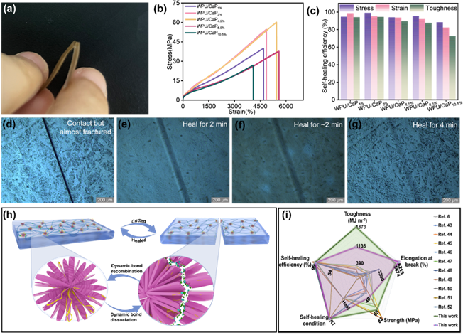 图6.(a)WPU/CaP4.5%试样即将断裂但仍保持连接的实物图;(b)愈合后试样的应力-应变曲线;(c)应力、应变及拉伸韧性的自愈合效率;(d-g)不同愈合时间下WPU/CaP4.5%试样愈合过程的偏光显微镜图;(h)自愈合机制示意图;(i)本研究的弹性体样品与文献报道的其他材料在力学性能及自愈合能力方面的综合对比。
