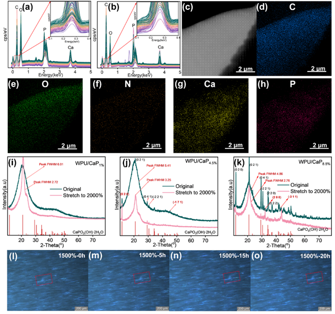 图4. WPU/CaP4.5%的EDS能谱分析:(a)脆断截面;(b)拉伸断裂截面;(c)WPU/CaP4.5%的TEM图;(d-h)对应的C、O、N、Ca和P元素分布图;(i-k)WPU/CaP1%、WPU/CaP4.5%和WPU/CaP8.5%在经历2000%应变拉伸前后的XRD曲线;(l-o)WPU/CaP4.5%样品在1500%拉伸应变下随时间变化的偏光显微镜图,其中红色方框标记区域为花状矿物晶体。
